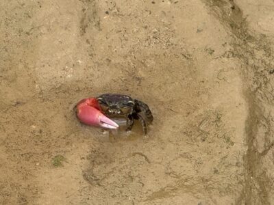 干潮に近い時間帯には、泥の上に小さなカニが出てくることがあります。片方のハサミが大きいシオマネキの仲間や、ぴょんぴょん動くトビハゼの姿は、大人でも思わず見入ってしまう可愛らしさがあります。